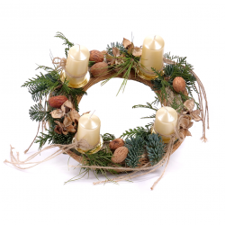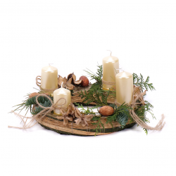 Adventný slamený veniec obtiahnutý dekoračnou látkou so štyrmi krémovými sviečkami, živou čačinou a prírodnými doplnkami. Sviečky sú súčasťou venca.
