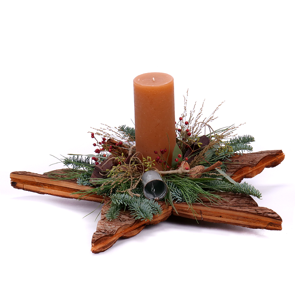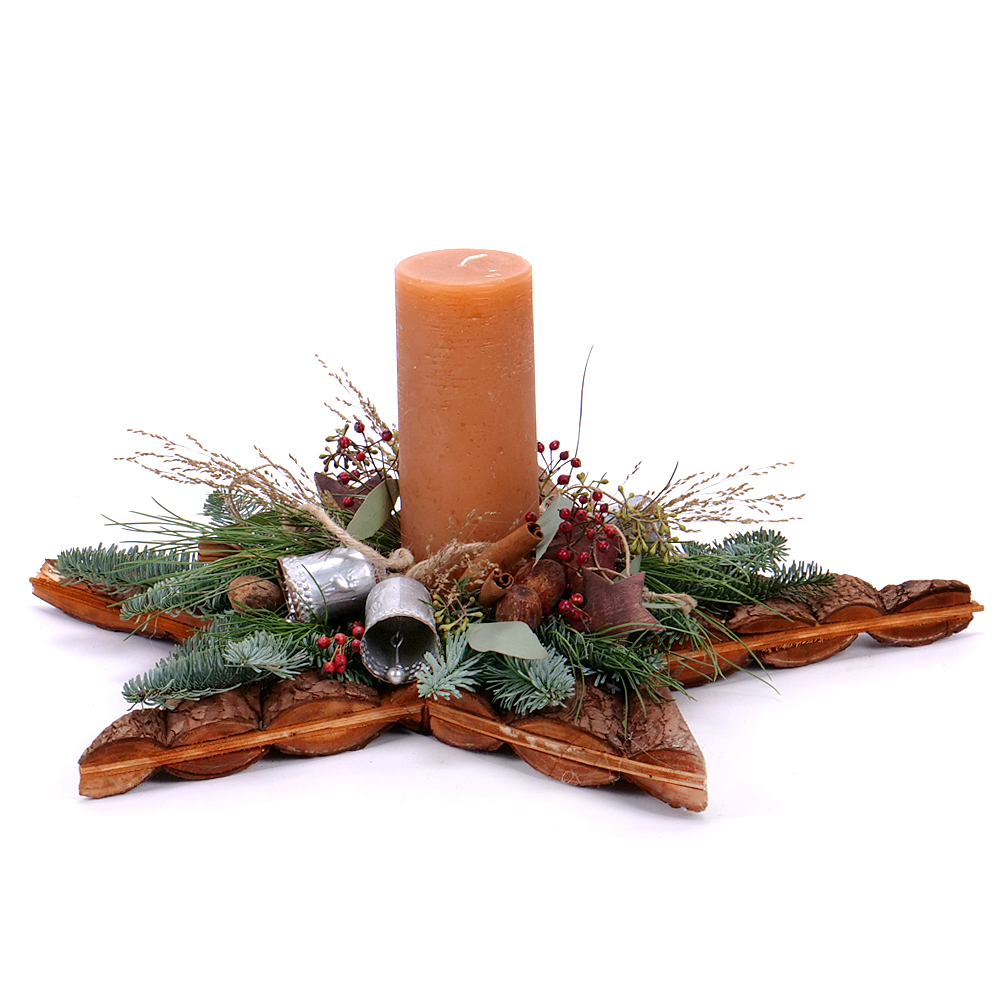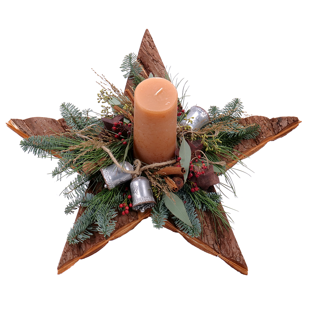 Aranžmán v tvare hviezdy na drevenom podklade s neopadavou čačinou nobilis s prírodnými doplnkami a kovovými zvončekmi. Súčasťou aranžmánu je svieca slabo hnedej farby.