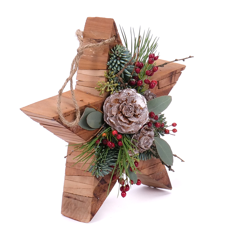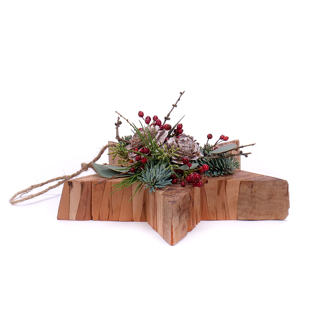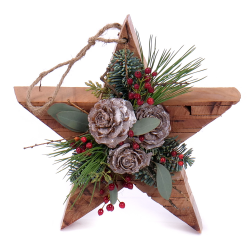 Zimný aranžmán na drevenej hviezde je dokonalou dekoráciou, ktorá vnesie do vášho domova čaro Vianoc. Tento jedinečný kúsok spája prírodné prvky so živou čačinou. Je ideálny na zavesenie na stenu, položenie na stôl či parapet a vynikne aj ako originálny darček. Drevená hviezda dodáva celému dizajnu rustikálny šarm a teplo, ktoré umocní sviatočnú atmosféru.