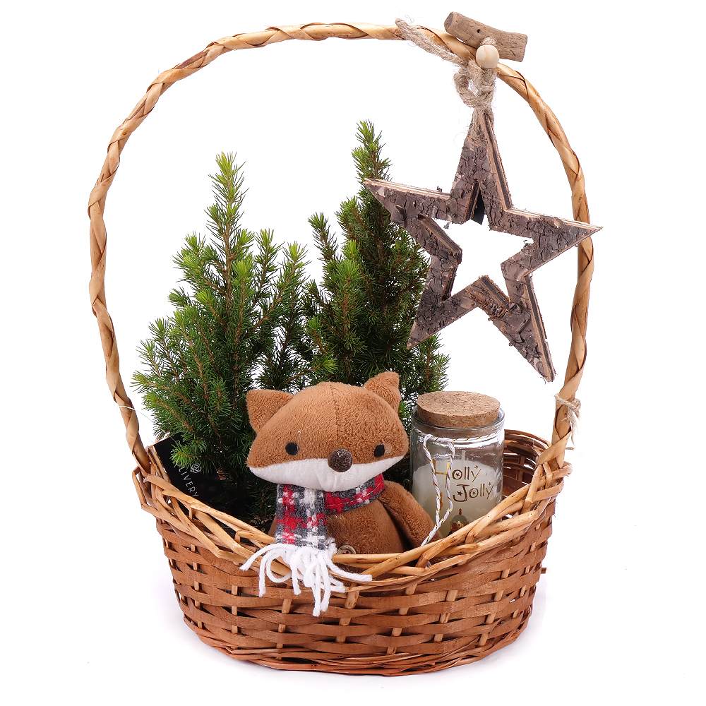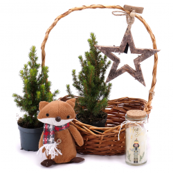 Darčekový set zložený zo živých stromčekov v črepníku - 2 ks, plyšového zvieratka - líška - 1 ks, dekoračnej sviečky - 1 ks, a závesnej drevenej hviezdy - 1ks. Súčasťou setu je prútený hnedý kôš.