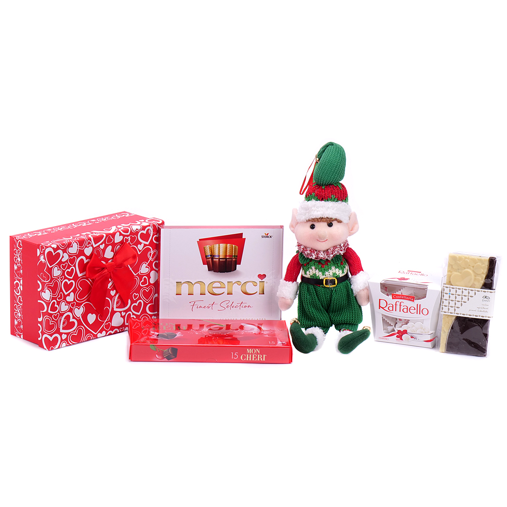 Dárkový červený box ve tvaru obdélníku s dezertem Raffaello - 1 ks, chipsy Pringles - 1 ks, ručně dělanou čokoládou Dany - 1 ks, vínem El Coto Rosado 0,75 l - 1 ks a dřevěnou dekorací - 1 ks.