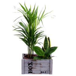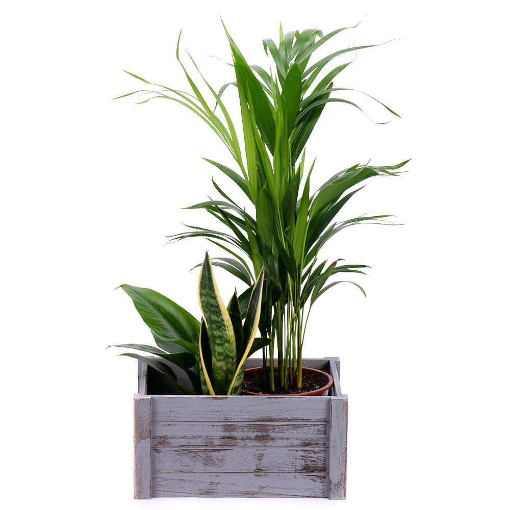 Set pokojových rostlin: Palma dypsis - 1 ks, Phlebodium aureum - 2 ks, asparagus - 1 ks, dřevěná bedýnka - 1 ks.
