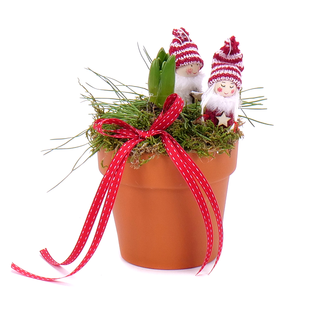 Veselý darček v podobe živého hyacintu v keramickom obale s dekoráciou a stuhou s prírodnými doplnkami.