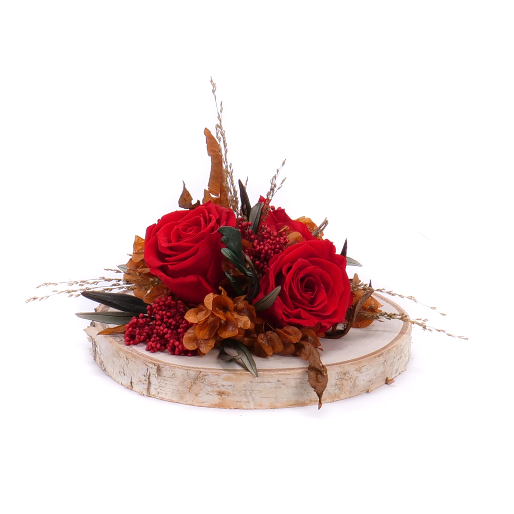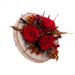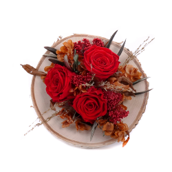 Darujte Vašim blízkym aranžmán s luxusnými trvácnymi kvetmi značky In Eterno, ktoré sú aranžované na drevenom podklade s prírodnými a preparovanými doplnkami.