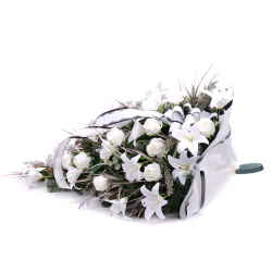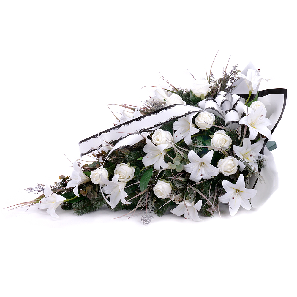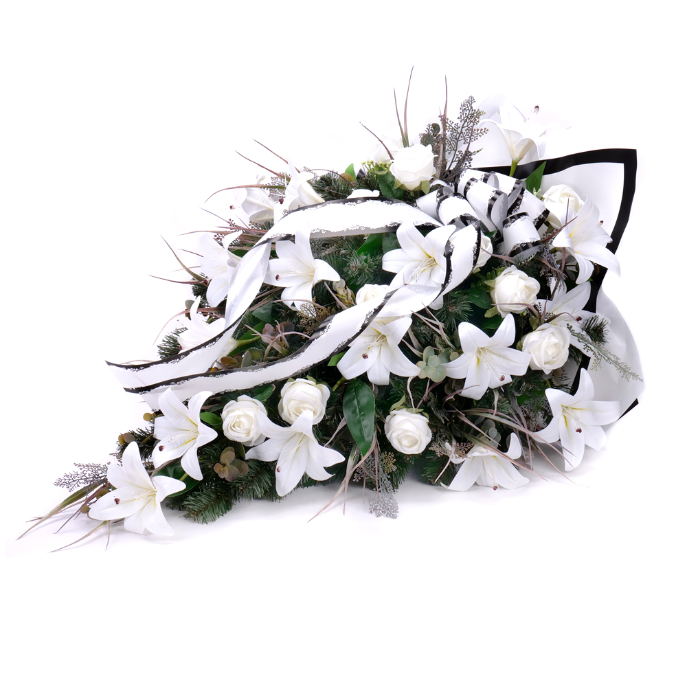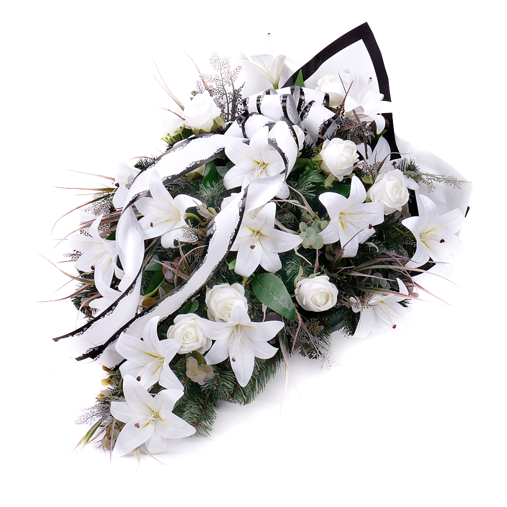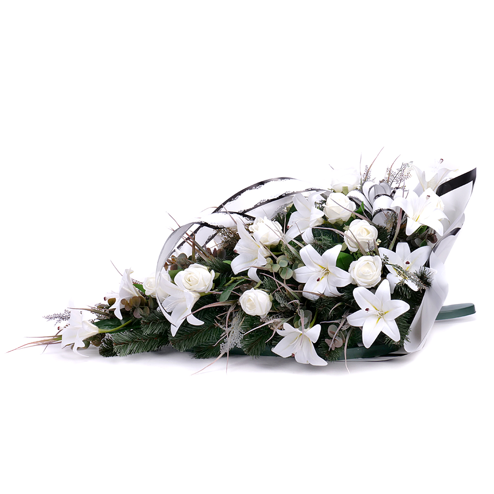 Smútočná kytica z umelej čačiny a umelých kvetov bielych ľalií a bielych ruží. Súčasťou je smútočný papier a stuha.