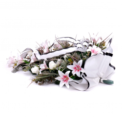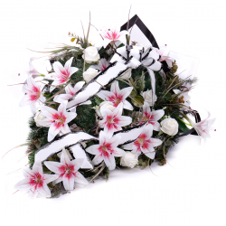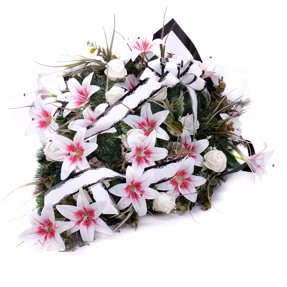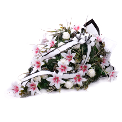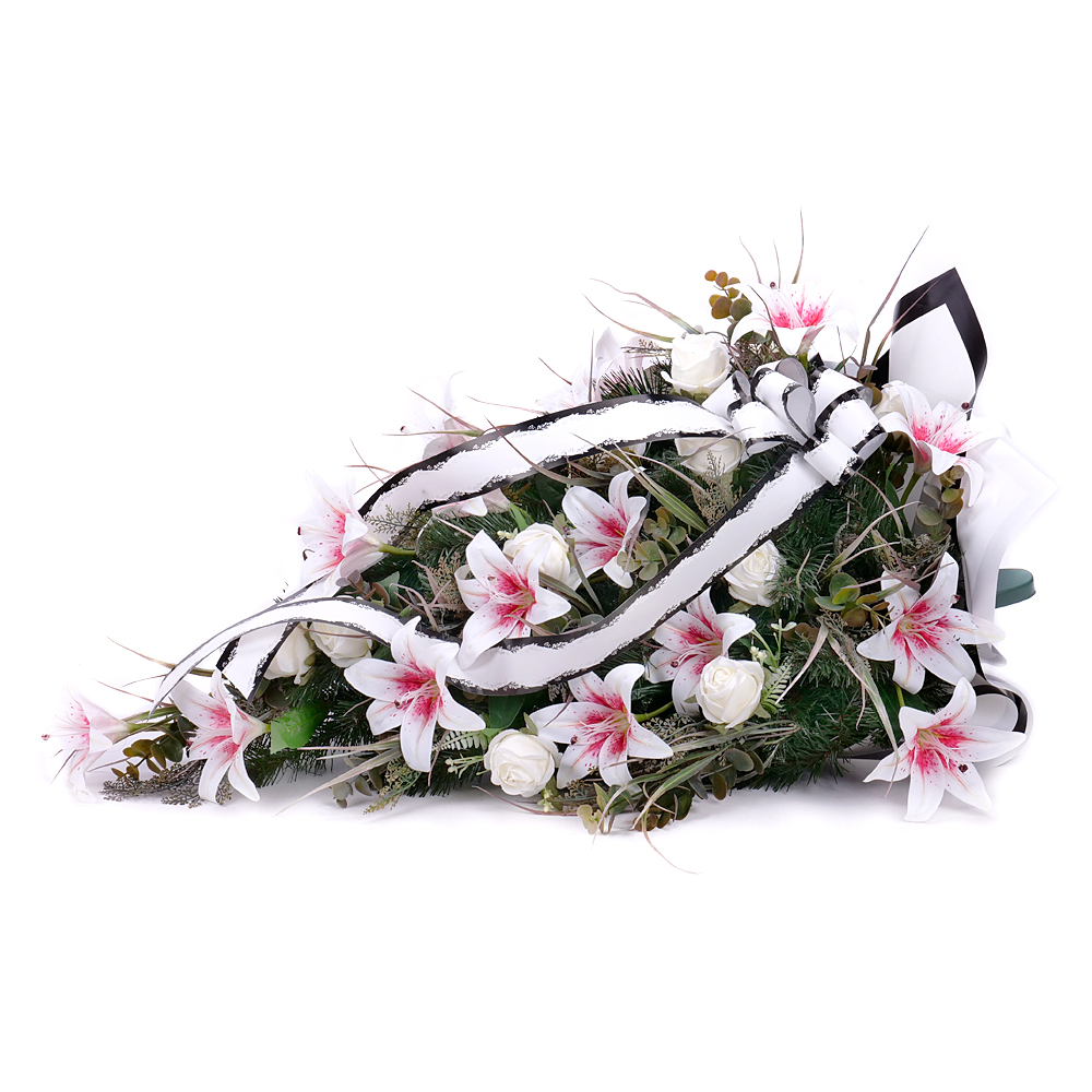 Smútočná kytica z umelej čačiny, ľalií a ruží jemnej bielo - ružovej farby. Aranžmán je doplnený o smútočný papier a stuhu.