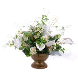 Smútočný aranžmán z umelých kvetov bielej farby aranžovaný v zaťaženej miske s umelou čačinou.