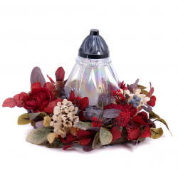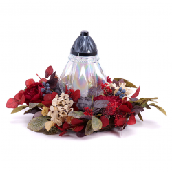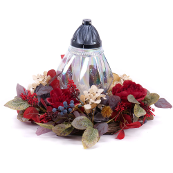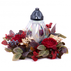 Smútočný veniec z umelých kvetov červenej farby so skleneným kahancom. Tento veniec je vhodný na hroby, pamätníky alebo pietne miesta, kde chcete s úctou a dôstojnosťou spomínať na svojich blízkych.