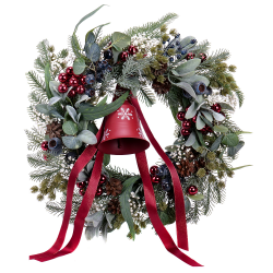 Veniec z umelej čačiny s vianočnými doplnkami, stuhou a kovovým zvoncom. Vhodná zimná dekorácia na dvere.