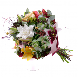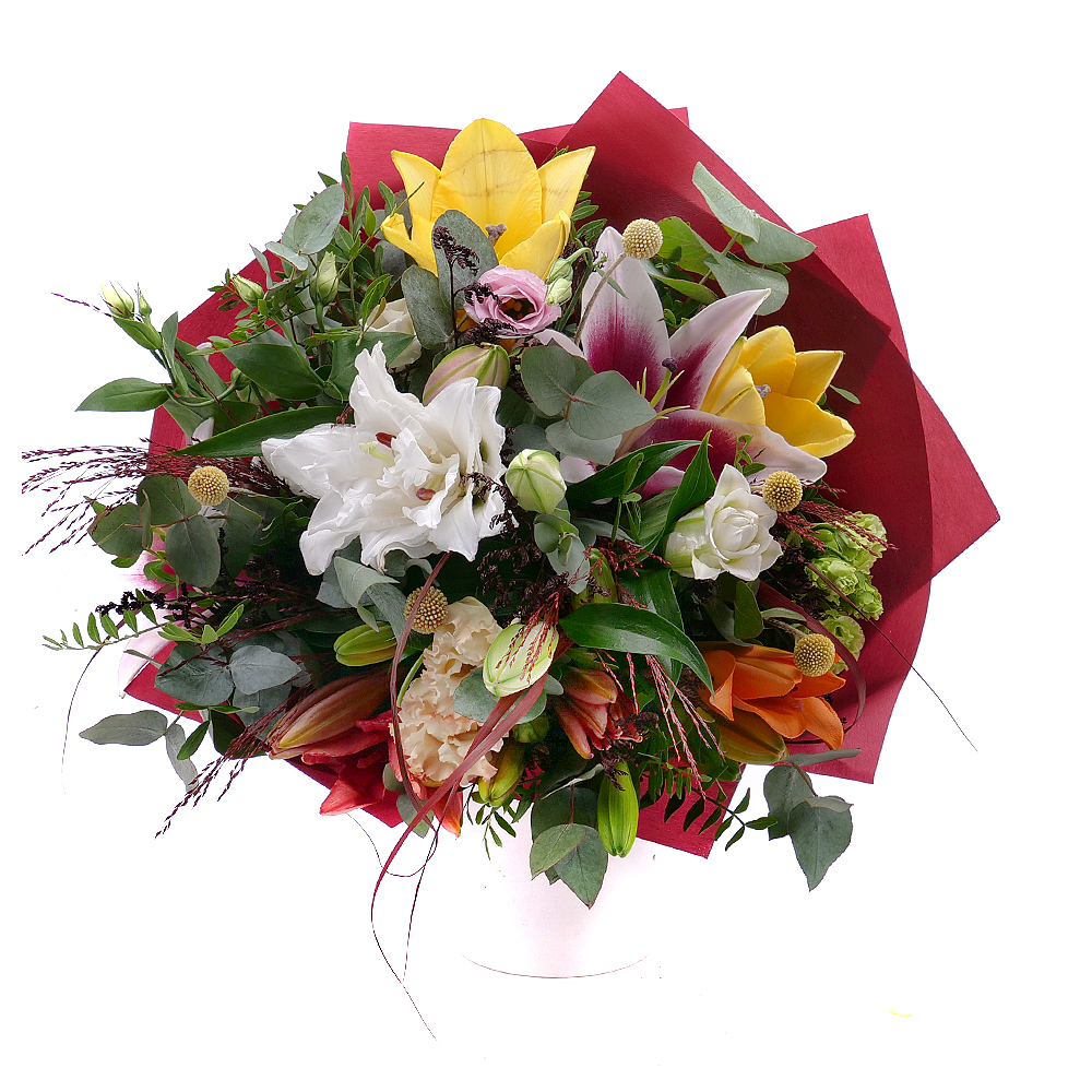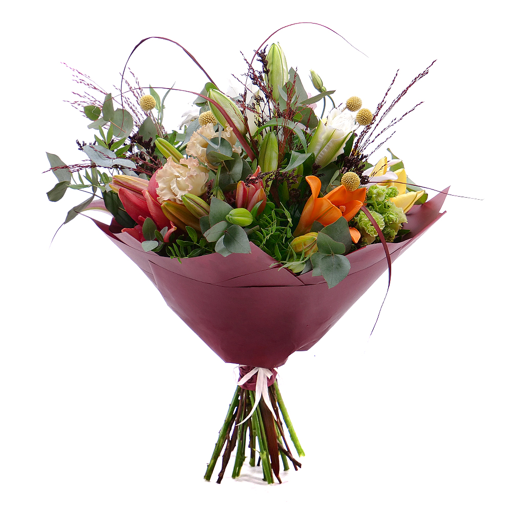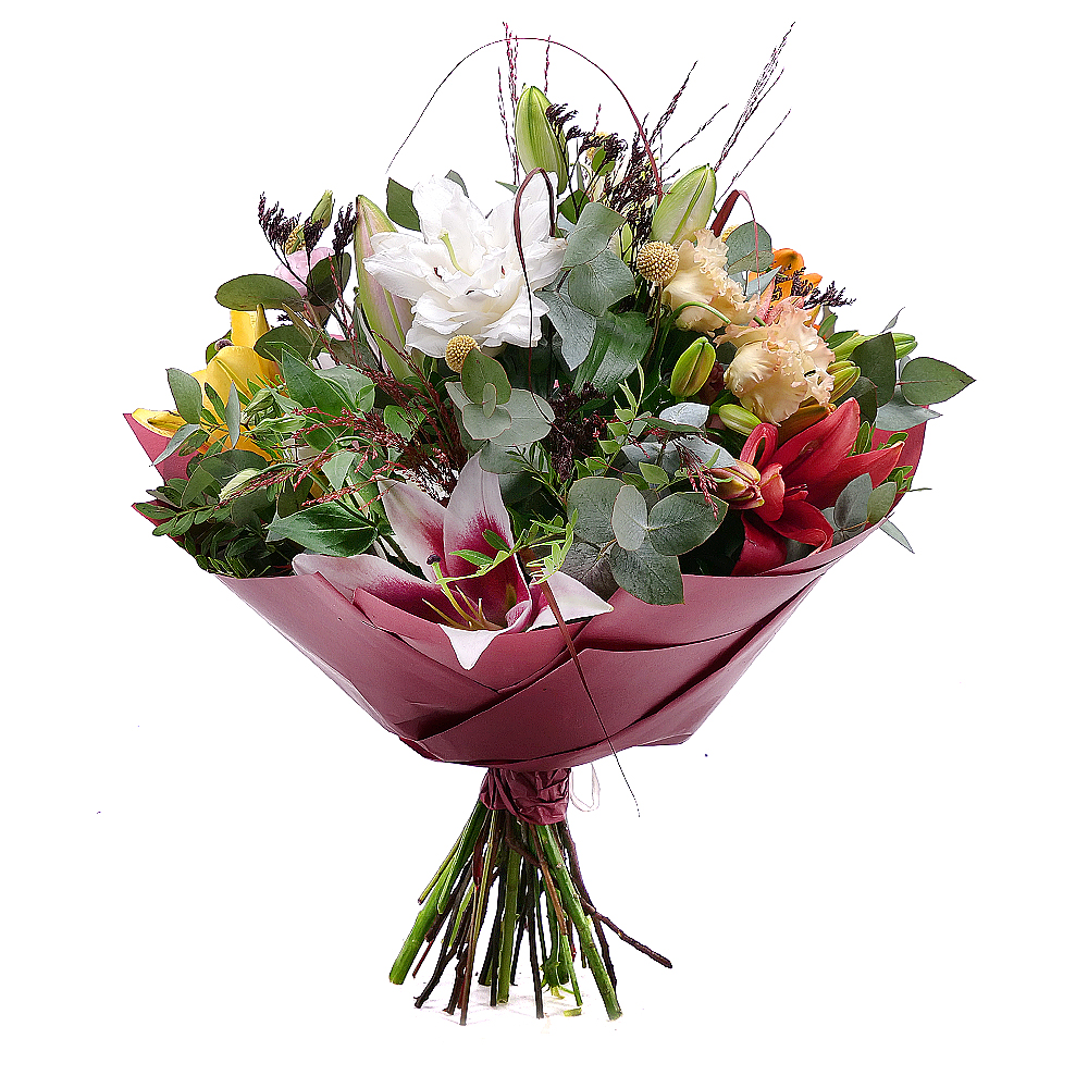 Kytice z lilií, lisianthusů, dekorativní zeleně, travin a přírodních doplňků, doplněná stylovým papírem a saténovou stuhou.