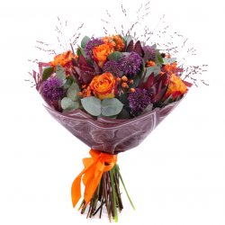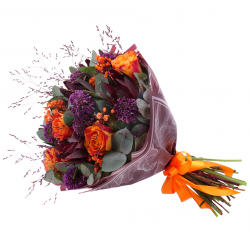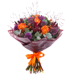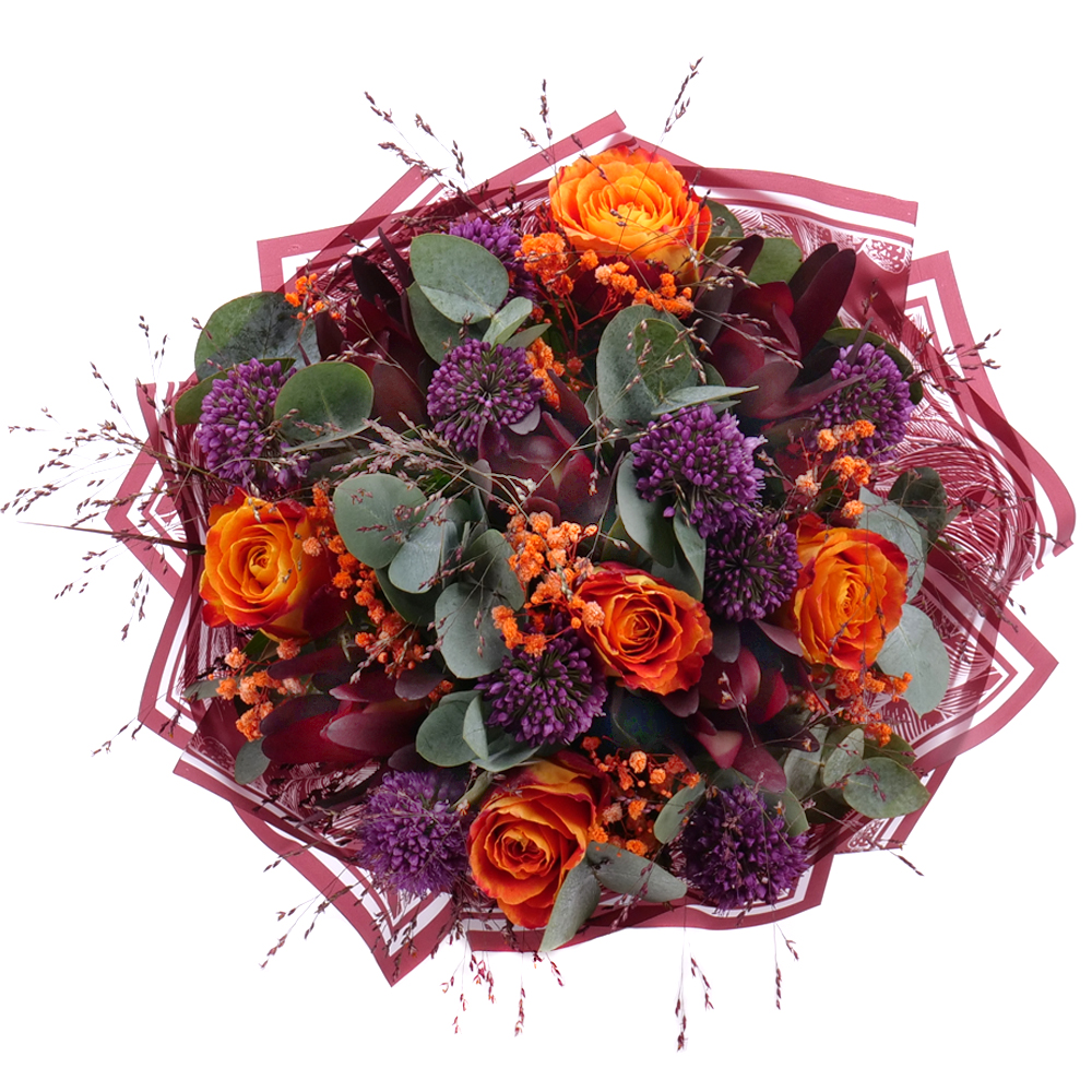Tato originální kytice propojuje dravost přírody s jemností elegance. Dominantní fialové hlávky okrasného česneku dodávají kytici výjimečný charakter, zatímco sytě oranžové růže přinášejí teplo, energii a vášeň. Eukalyptus se svým svěžím aroma vnáší do kompozice lehkost a moderní nádech. Celek dotváří okrasné trávy, které přidávají pohyb a přirozenou dynamiku. Ideální volba pro ty, kteří hledají něco nevšedního, výrazného a nezapomenutelného.