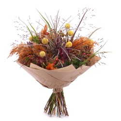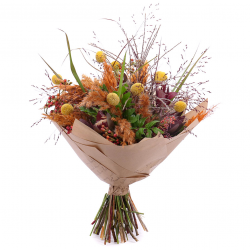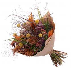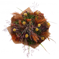 Originální podzimní kytice spojuje teplé odstíny přírody s netradičními texturami. Dominantní oranžová kortaderie přináší vzdušnost a pohyb, zatímco jemná stébla panici dodávají kytici lehkost a přirozený šarm. Exotický leucadendron v zemitých tónech vnáší do kompozice hloubku a kontrast, a výrazné žluté kuličky craspedie ji rozzáří slunečním akcentem. Toto aranžmá je ideální jako sezónní dekorace, dar nebo stylový doplněk do interiéru – oslava podzimu v její nejkrásnější podobě.