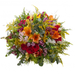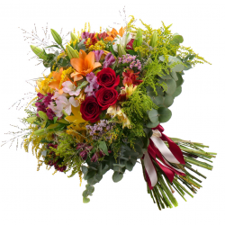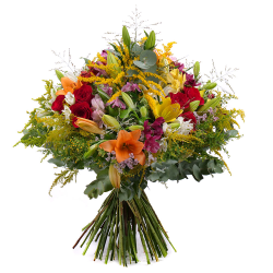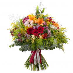 Barevná kombinace alstromerií a lilií doplněná o 9 červených růží vytváří ideální letní aranžmá. Díky eukalyptu a liliím kytice příjemně voní a díky solidágu nabývá stylu bohaté luční kytice.
