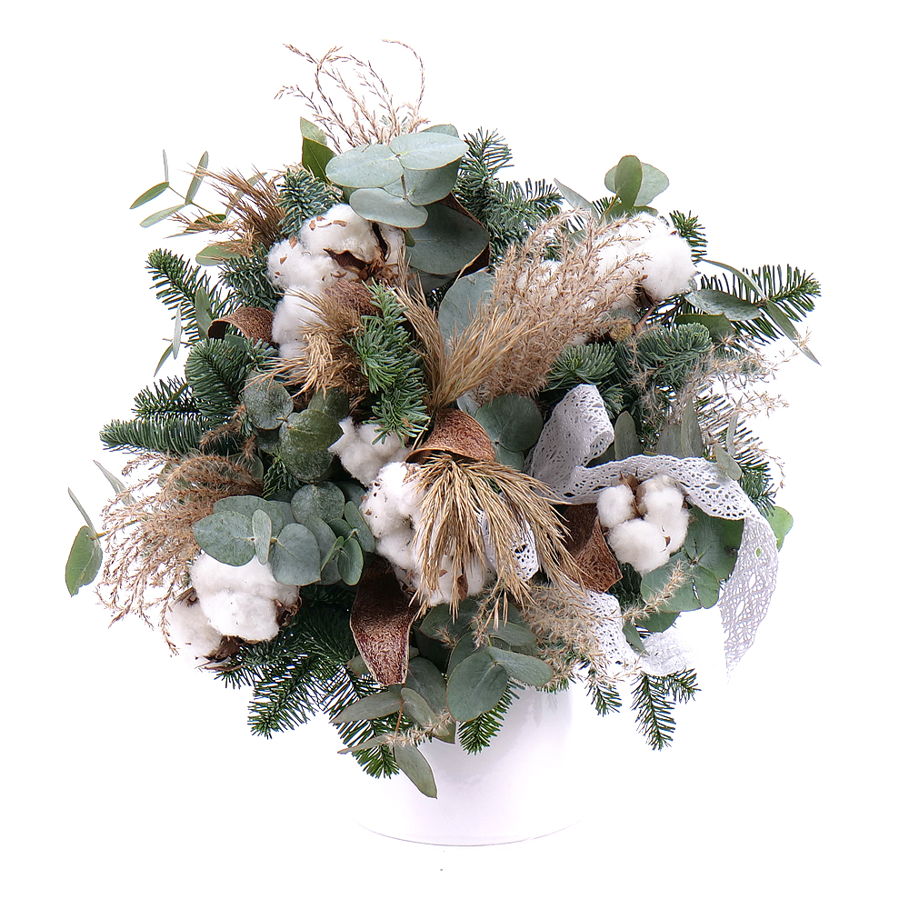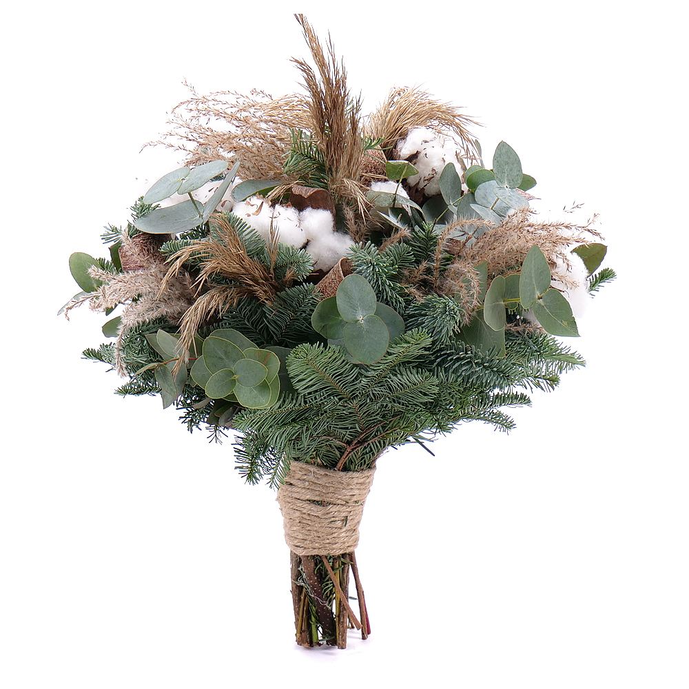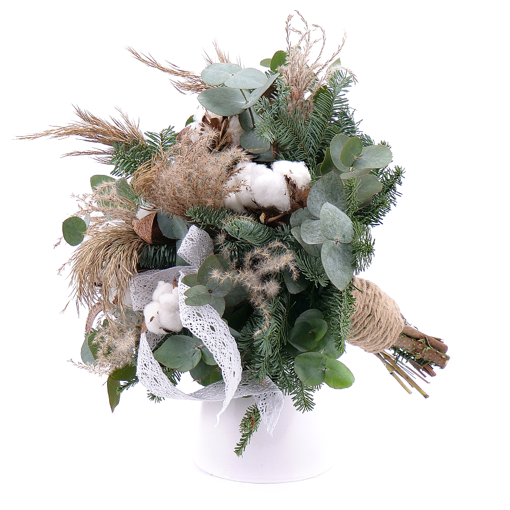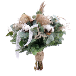 Zimní kytice s nádechem Vánoc z chvojí nobilis, bavlny, přírodních trav a sušených doplňků. Součástí kytice je dekorační krajková stuha.