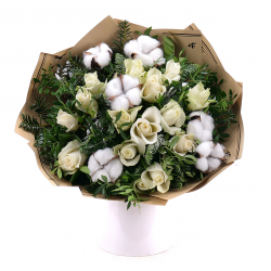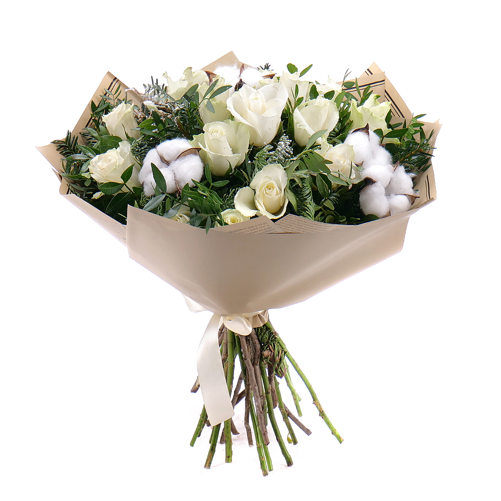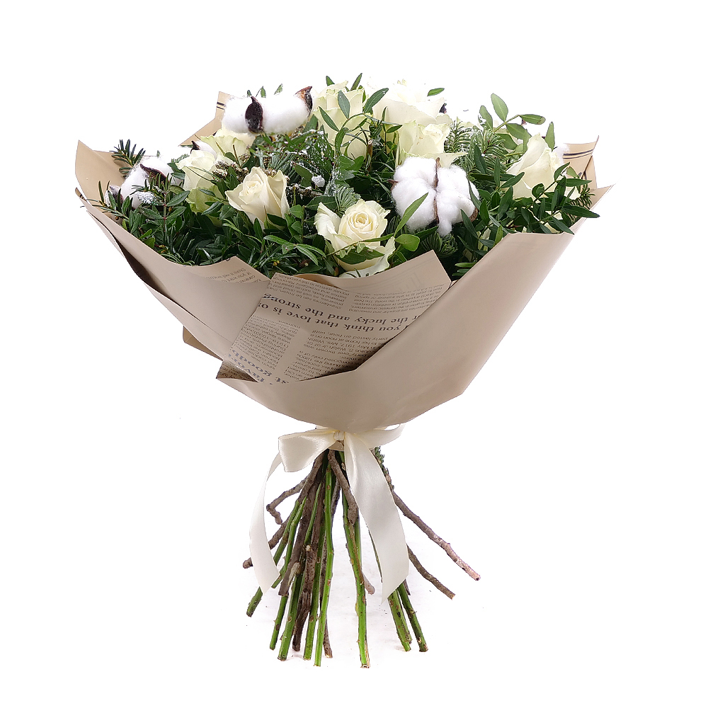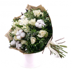 Vánoční kytice z růží laděná do bílé barvy s přírodními doplňky. Zpříjemní Váš domov a přinese vánoční atmosféru na štědrovečerní stůl.