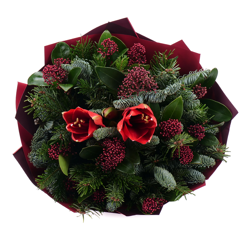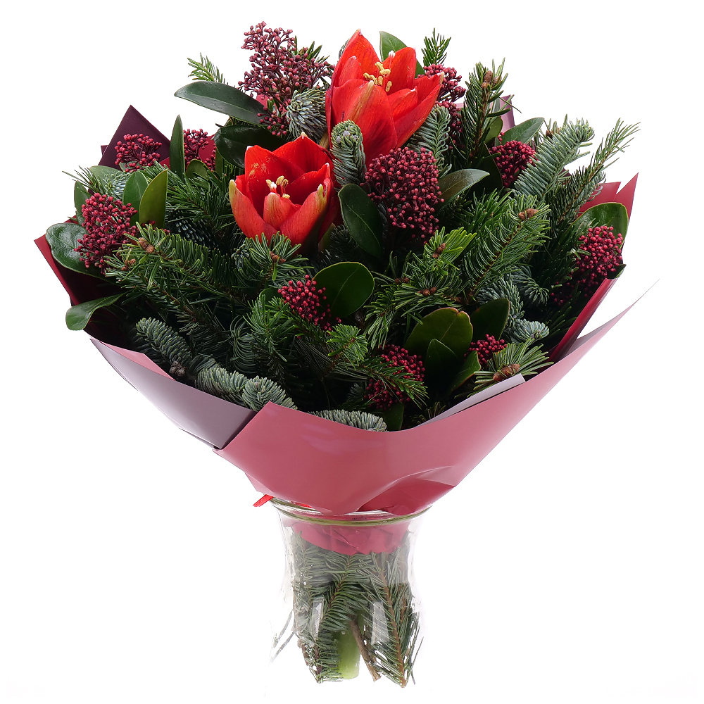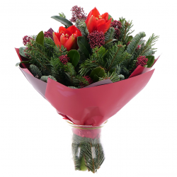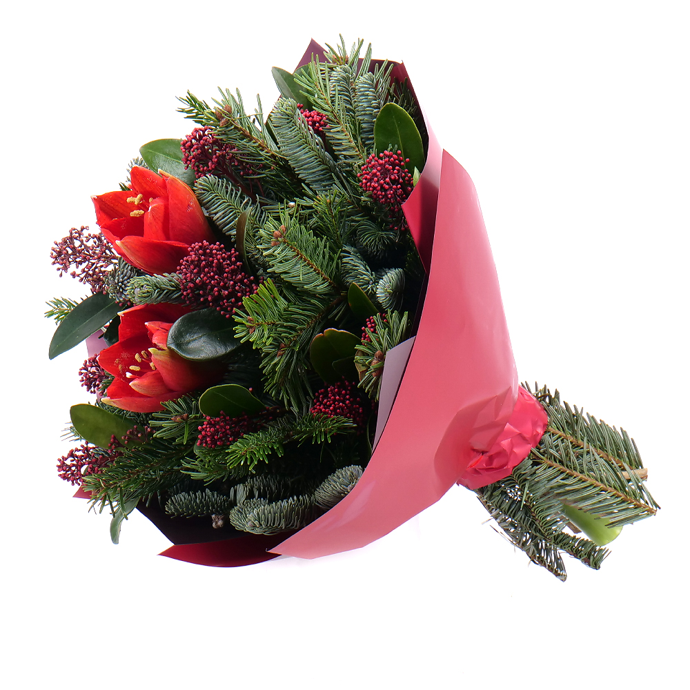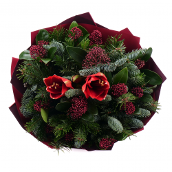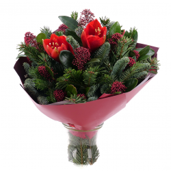 Elegantní zimní kytice s dominantním amarylisem, který upoutá svými velkolepými květy a přidává do kytice sofistikovaný šarm. Doplňuje ho jemná skimmie se svými hustými drobnými kvítky. Živá chvojí dodává kytici svěží zeleň a nádech zimní atmosféry. Tato kytice je ideální jako dárek nebo pro výzdobu interiéru během zimního období. Její přírodní barvy a textury dokonale navodí klidný a příjemný zimní dojem.