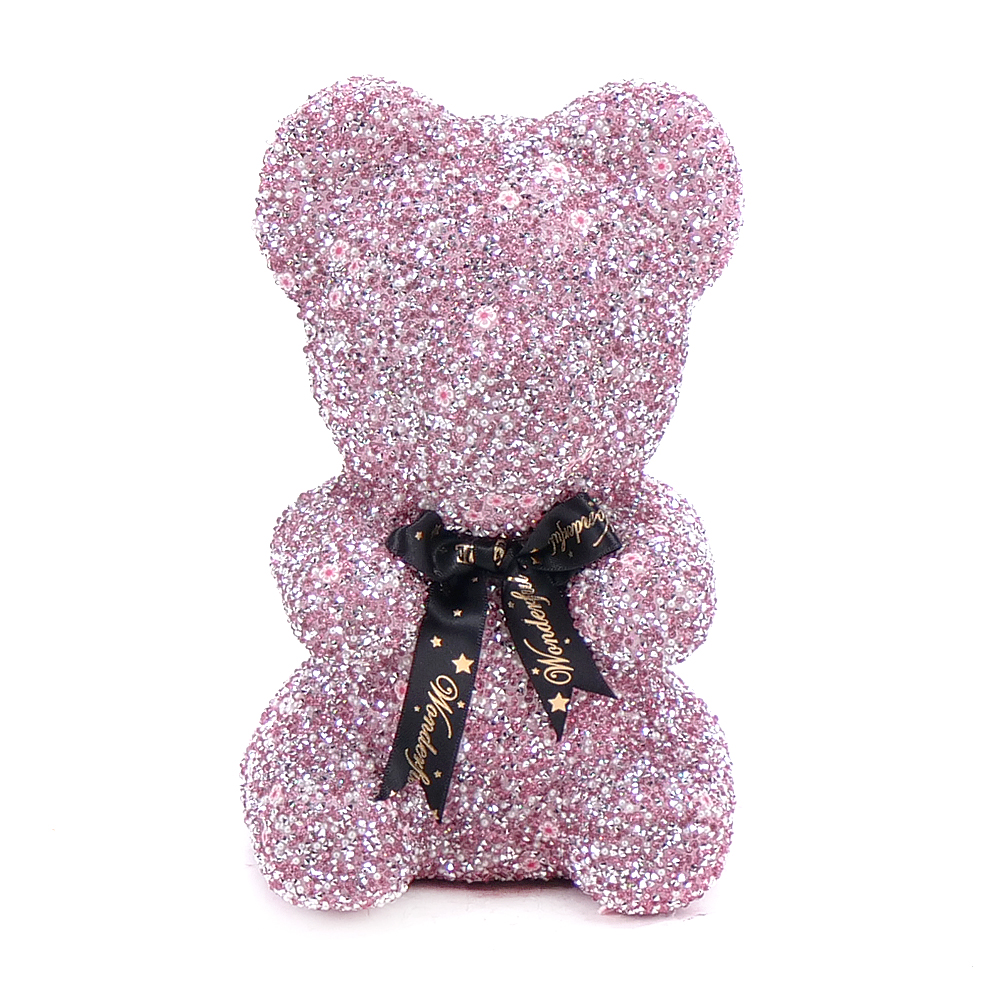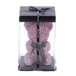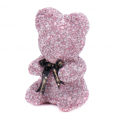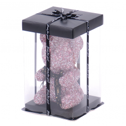 Unikátní růžový medvídek pokrytý třpytivými glitry v průhledném plastovém obalu provázaný černou stuhou s anglickým nápisem "Jen pro Tebe".