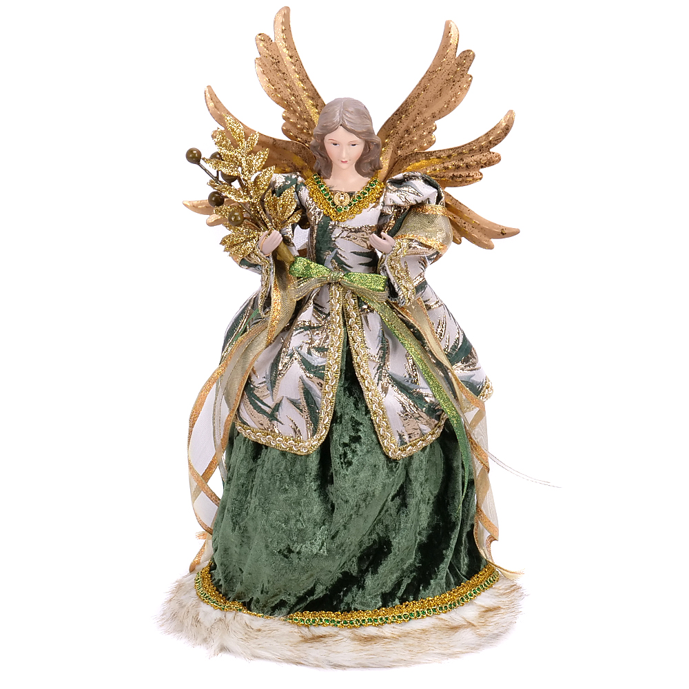 Vianočná látková postava anjela v zeleno - zlatom oblečení. Vhodná dekorácia na stôl alebo aj na vrcholec stromčeka (vnútro anjela tvorí plastový kužel)