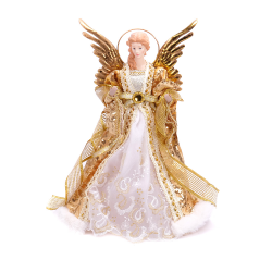 Vianočná látková postava anjela v zlato - bielom oblečení. Vhodná dekorácia na stôl alebo aj na vrcholec stromčeka (vnútro anjela tvorí plastový kužel)