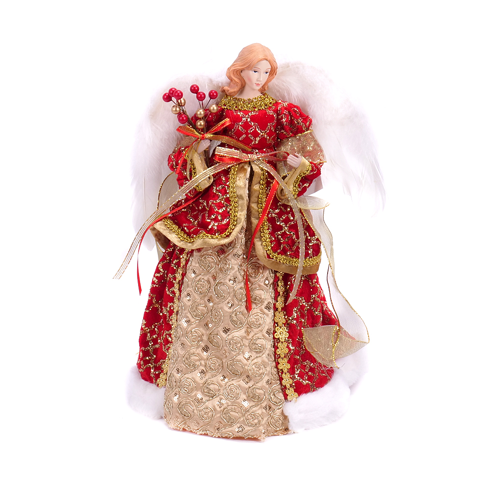Vianočná látková postava anjela v zlato - červenom oblečení. Vhodná dekorácia na stôl alebo aj na vrcholec stromčeka (vnútro anjela tvorí plastový kužel)