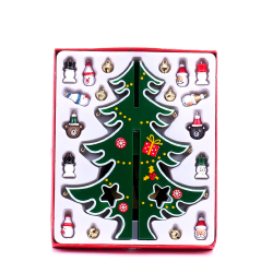 Vianočná dekorácia v podobe dreveného vianočného stromčeka s mini ozdobami na zavesenie.