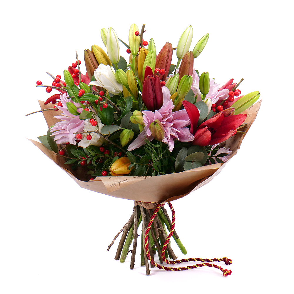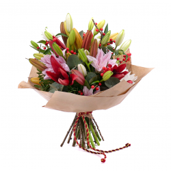 Darujte Vašim blízkým kytici z barevných lilií, dekorační zeleně a červeného ilexu. ... Více