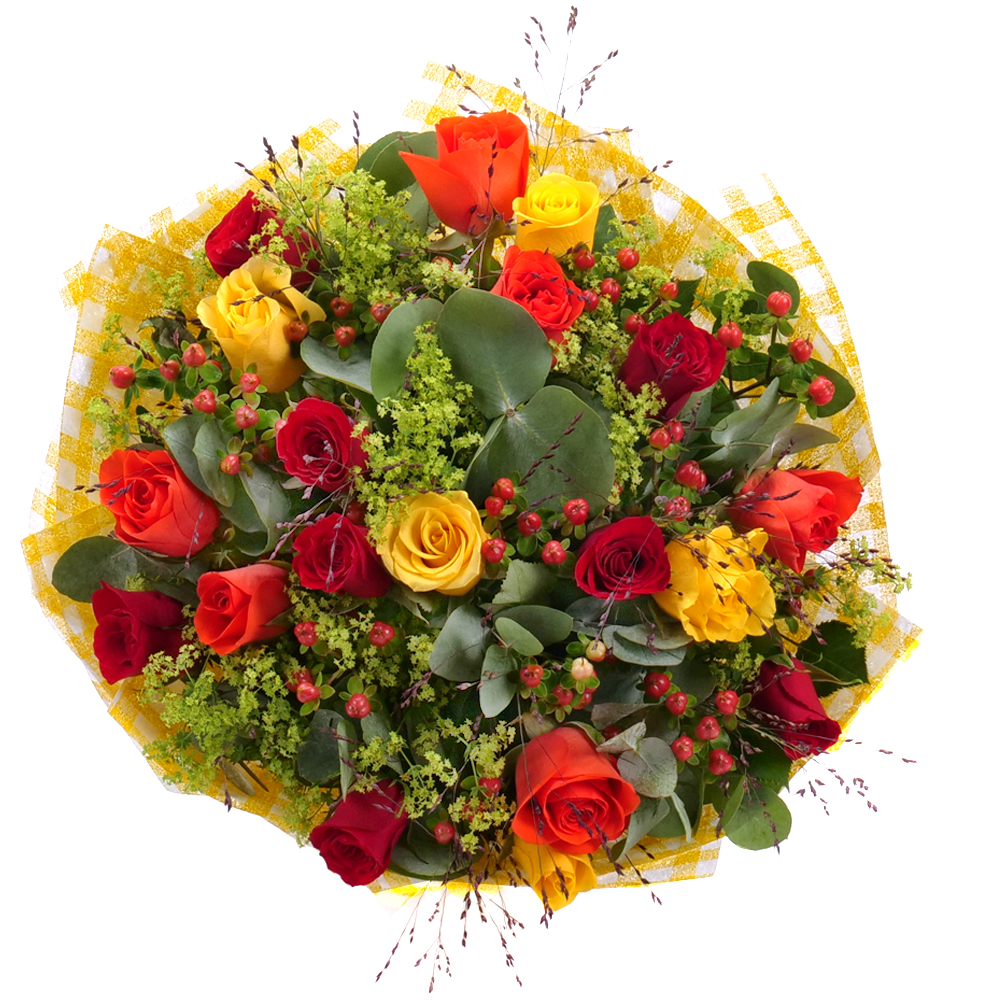 Žiarivá živá kytica je harmonickým spojením teplých farieb a sviežej zelene. Dominujú v nej ruže v odtieňoch oranžovej, červenej a žltej, ktoré symbolizujú radosť, vášeň a priateľstvo. Ich sýte farby vytvárajú dynamickú a energickú atmosféru, ktorá rozžiari každý priestor. Doplnená o voňavý eukalyptus a jemnú dekoračnú trávu, kytica pôsobí sviežo, prirodzene a elegantne. Ideálna ako darček na vyjadrenie vďačnosti, lásky či úprimného potešenia.
