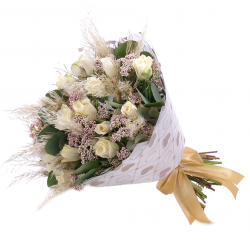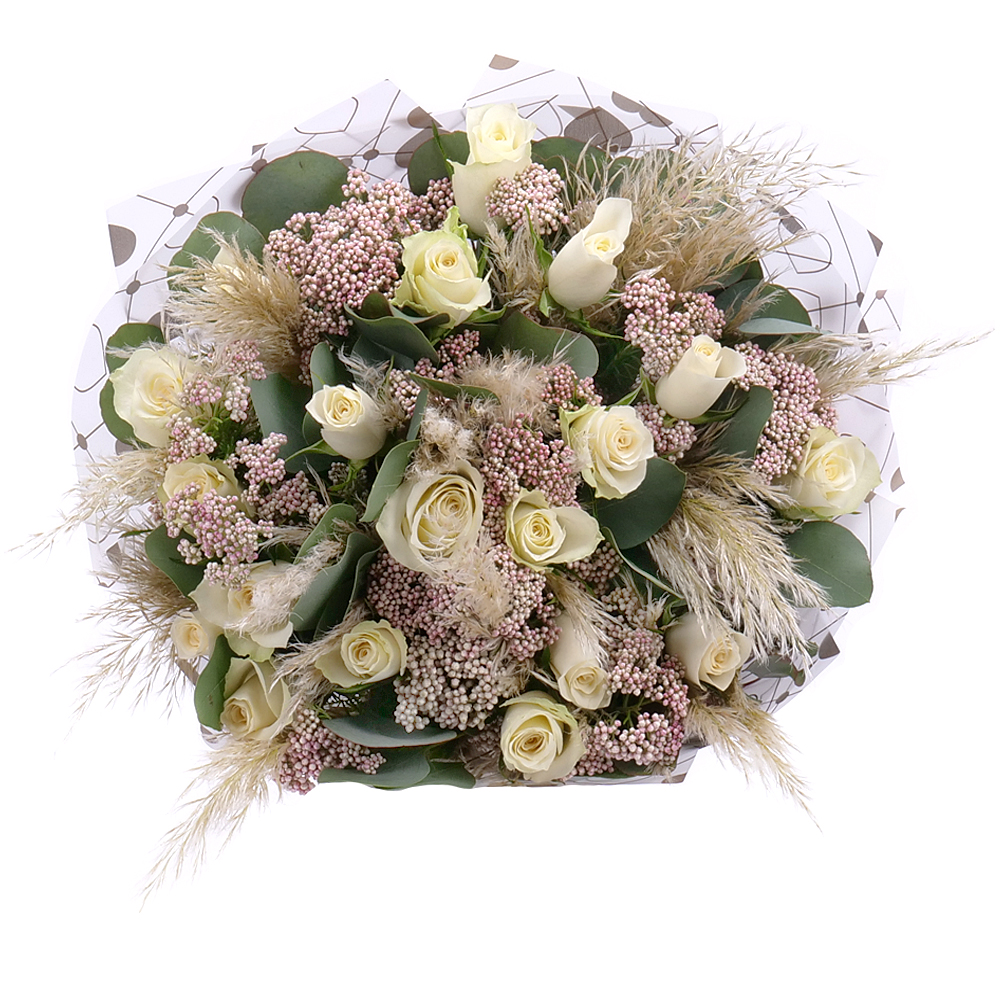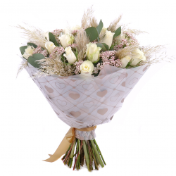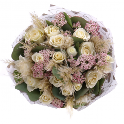 Stylová kytice s akcenty pudrově růžové barvy naaranžovaná z kombinace růžových růží, růžových karafiátů, bílých mini chryzantém, lysianthusů a zeleně. ... Více