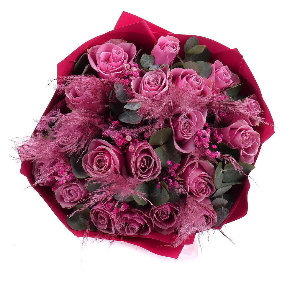 Jemná, nadčasová a plná nežnosti – táto kytica je stelesnením romantiky. Dominantné ružové ruže symbolizujú lásku a nežné city, zatiaľ čo vzdušná ružová gypsophila dodáva aranžmánu ľahkosť a pôvab. Cortaderia, so svojím nadýchaným, prirodzeným vzhľadom, vnáša do kytice nádych elegancie a moderného štýlu. Kytica je krásne zabalená v dekoračnom papieri a previazaná stuhou, čo jej dodáva luxusný a slávnostný vzhľad.