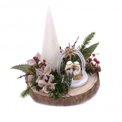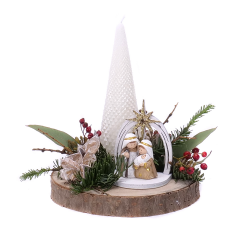 Vianočný svietnik na dreve so Svätou Rodinou, prírodnými doplnkami a čačinou. Vhodná dekorácia na stôl. ... Více