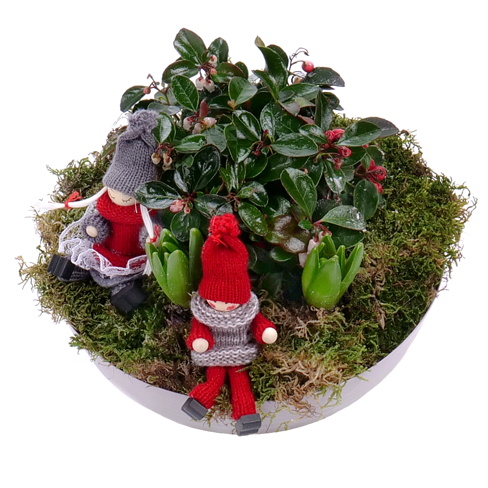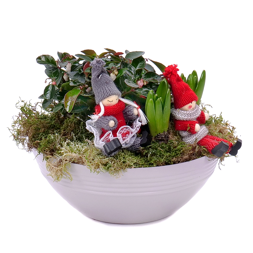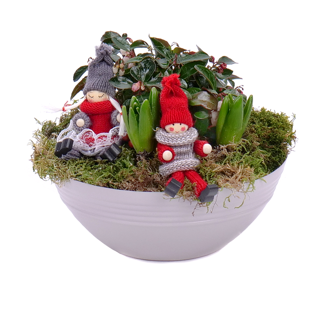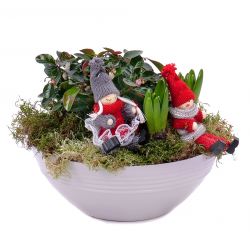 Dekorácia zo živých hyacintov a rastliny gaultheria s prírodnými doplnkami a mini dekoračnými postavičkami v plechovom obale. Vhodná dekorácia na stôl, terasu či zimnú záhradu.